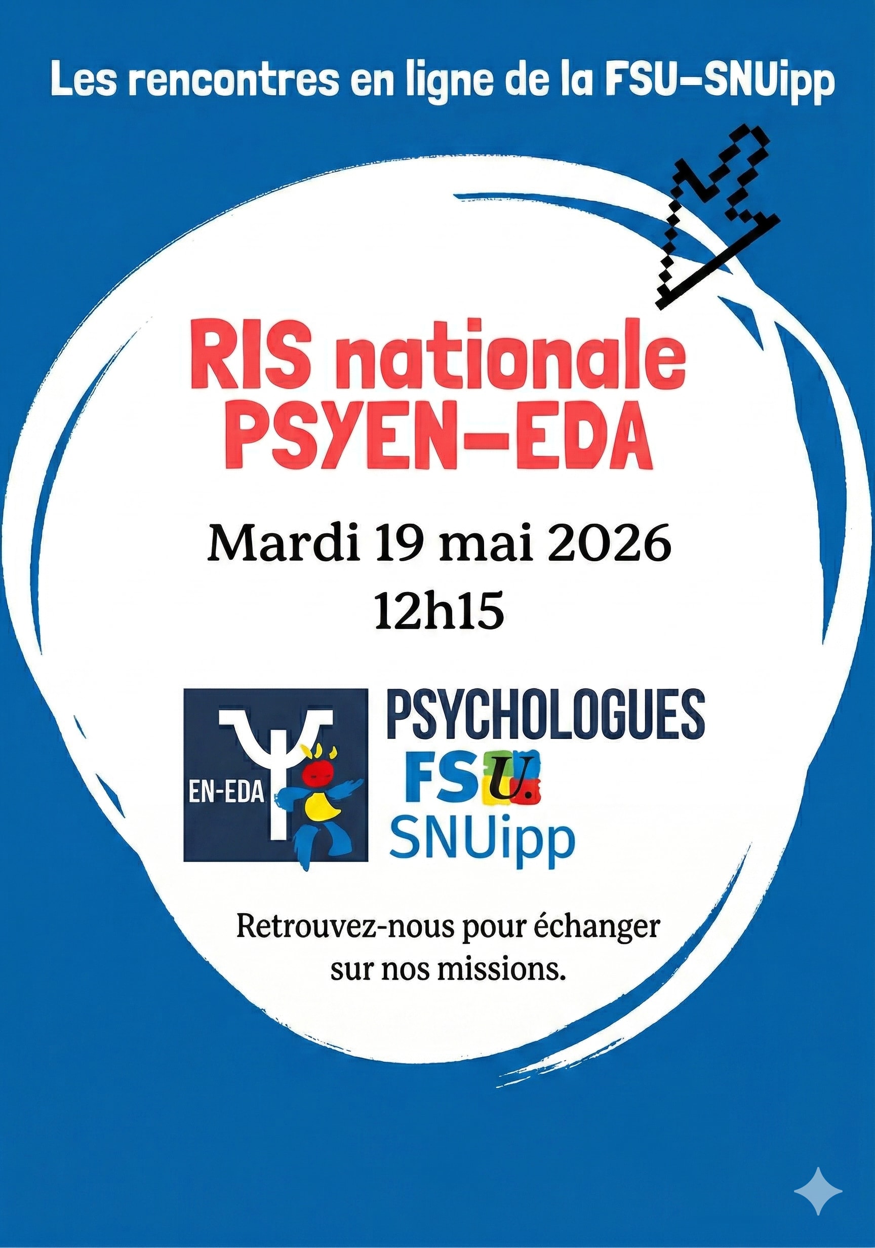 Vous recevrez le lien à votre adresse mail quelques jours avant la réunion d'information syndicale. Si vous avez des questions particulières sur la situation des PsyEN, vous pouvez les noter dans la partie "commentaires" du formulaire ou nous les transmettre en amont à l'adresse suivante psy@snuipp.fr