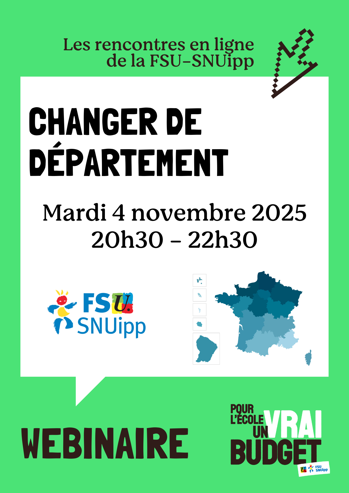 La FSU-SNUipp vous propose un webinaire le mardi 4 novembre 2025, de 20h30 à 22h30 pour comprendre comment changer de département. Ce sera l'occasion de revenir sur la circulaire de l'année et de répondre à toutes vos questions.